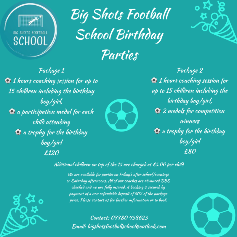 Please contact us for further information or to book - Tel: 07780 438623; Email: bigshotsfootballschool@outlook.com